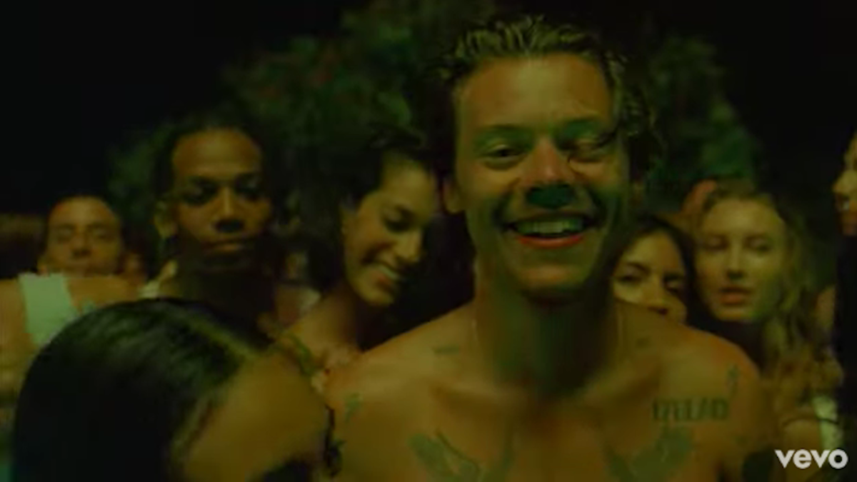In the "Lights Up" music video, Harry is shirtless while he's surrounded by men and women who are also not wearing much, as they embrace the singer. In another scene, he's fully-clothed and standing in a body of water, while in another shot he's riding on the back of a motorcycle.