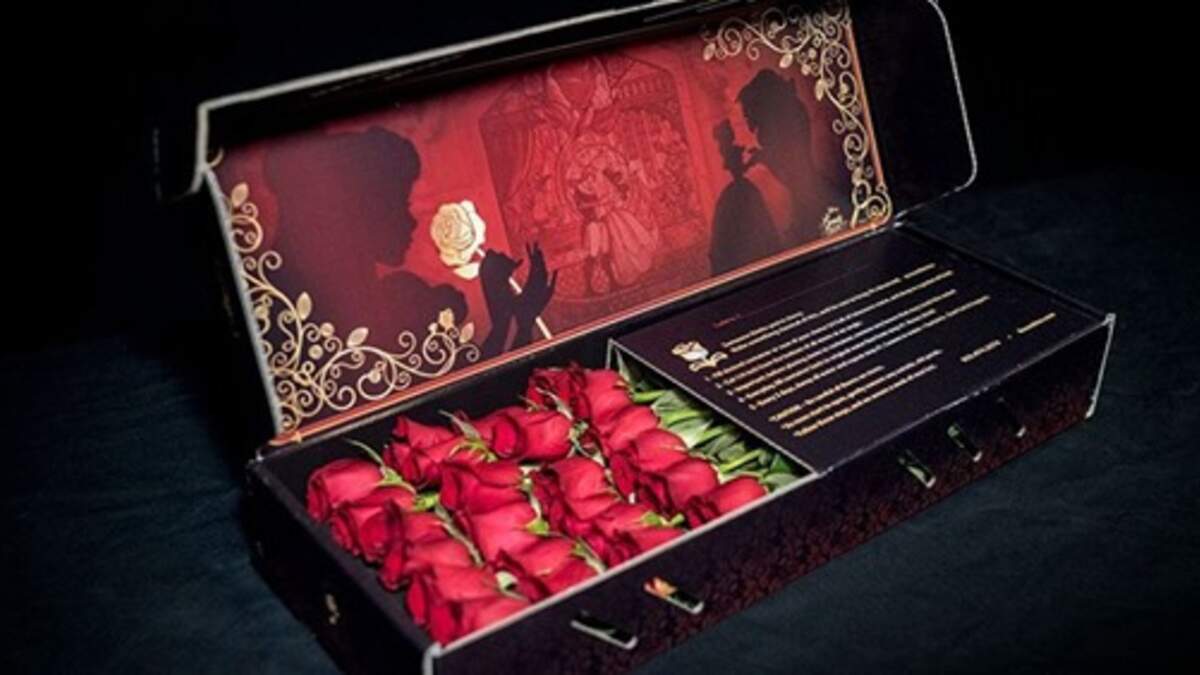 It's an actual Beauty and the Beast-themed box, complete with outlines of Belle and The Beast! You can choose between one or two dozen roses. They're going to set you back about $109 and $199 but I think it's totally worth it. The Beauty and the Beast rose bouquet is only available in red during Valentine’s Day week.